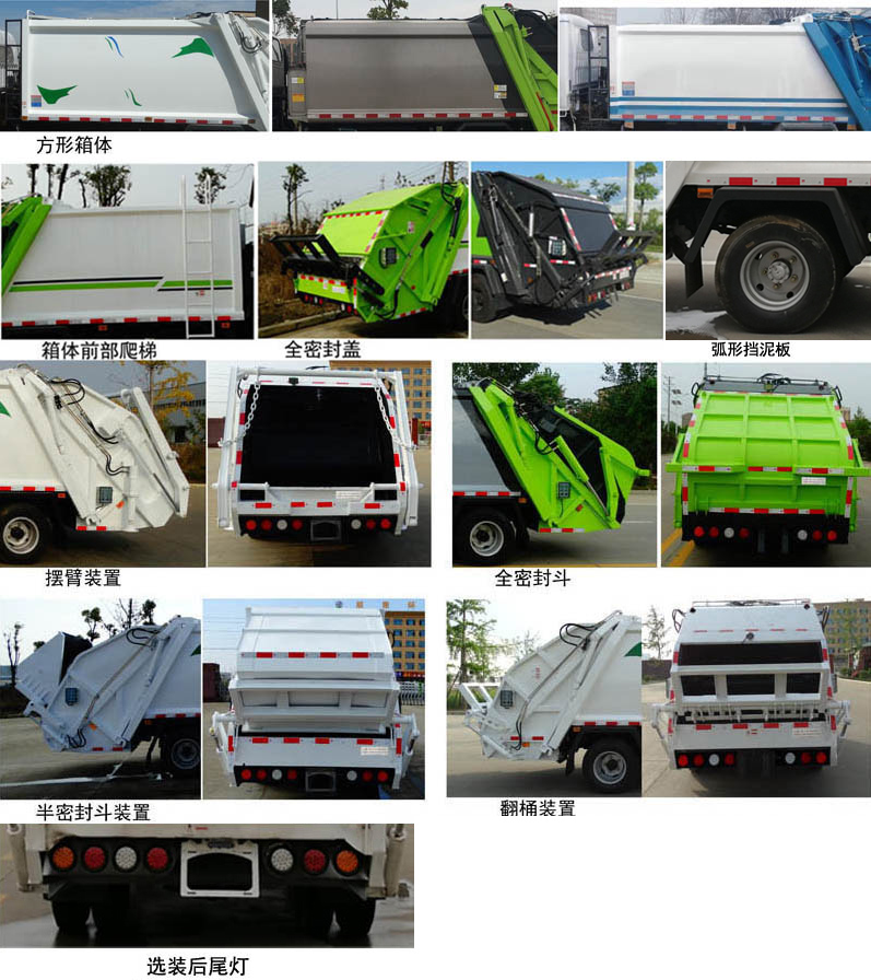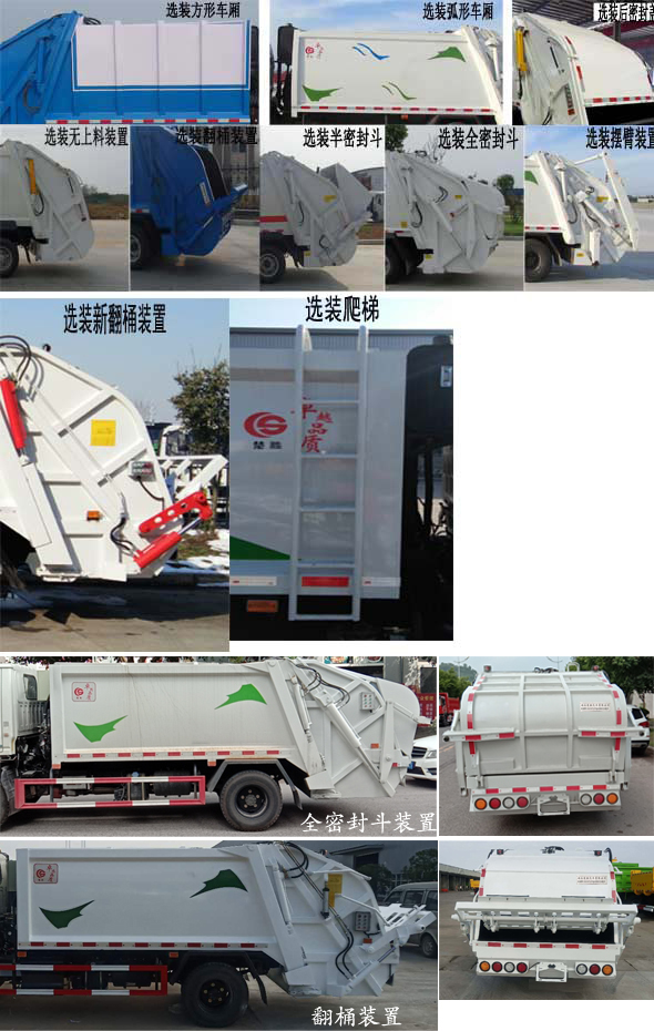 | 配置 | 1、該車主要專用裝置由箱體、壓縮系統組成,用于垃圾的收集與清運。該車可選裝方形或弧形箱體,選裝全密封蓋裝置,選裝方形擋泥板,選裝箱體前部爬梯,選裝后部工作裝置。選裝工作裝置時,外形長(mm)/后伸(mm)/整備質量(kg)對應關系:①無上料裝置: 6525/-/5530;②擺臂裝置: 6685/160/5850;③全密封斗裝置:6725/200/5850;④翻桶裝置,半密封斗裝置:6925/400/5850。2、側防護采用冷彎型鋼/Q235,螺栓連接;后防護由專用裝置替代,下邊緣離地高500mm。3、ABS系統型號:VIE ABS-II,ABS系統生產廠家:浙江萬安科技股份有限公司。發動機JX4D30D6H的油耗值為13.9 L/100km。隨底盤選裝左右車門上方黑色貼膜可選擇取消。選裝輪輞外觀。選裝前臉、前部燈具。該車型可選裝ETC車載裝置. | ||