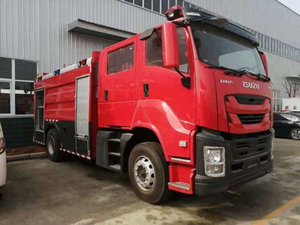 7噸消防車采用慶鈴汽車股份有限公司QL1180EQFRY 型二類汽車底盤,改制雙排駕駛室,乘員2+3人,該車駕乘舒適輕便。上裝采用內(nèi)藏式水罐,整車載液量水為4650kg,泡沫為1950kg。器材箱采用高質(zhì)量鋁合金卷簾門。底盤取力,發(fā)動機型號為6HK1-TCG61,最大功率177kW,通過萬向聯(lián)軸器驅(qū)動安裝在汽車尾部泵房里的上海雄真CB10/60型常壓消防泵,可在1.0MPa下穩(wěn)定輸出60L/s的流量;車頂安裝成都威斯特消防器材有限責任公司生產(chǎn)的PL8/48型消防炮(泡沫消防車),流量48L/s,對應壓力0.8MPa,最大承壓1.3MPa,射程 水≥70m 泡沫≥60m,可360°旋轉(zhuǎn)。同時該車具有比功率大、綜合性能強、操控集中簡便等特點。