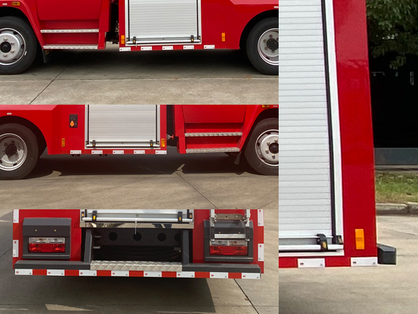 其它:罐體容積為5.000立方米,為異形罐體,前端尺寸:1245×1150×1160mm,后端尺寸:1500×2040×1160mm,整體式側防護結構,后防護裝置材料:Q235A,截面尺寸:100×100mm,與車輛連接方式:螺栓連接,后防護離地高度:450mm,ABS生產企業為襄陽東風隆誠機械有限責任公司,型號為ABS/ASR-24V-4S/4M。主要專用裝置有消防泵、消防炮。